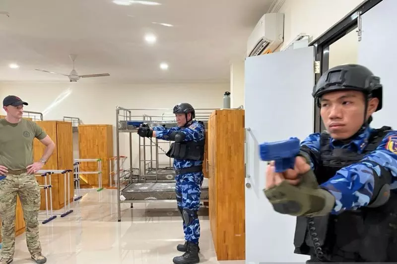 Badan Keamanan Laut (Bakamla) Indonesia menggandeng beberapa negara seperti Amerika Serikat dan Vietnam dalam pelatihan Visit, Board, Search, and Seizure (VBSS) di Maritime Training Center Bakamla RI, Kota Batam, Selasa (4/11).