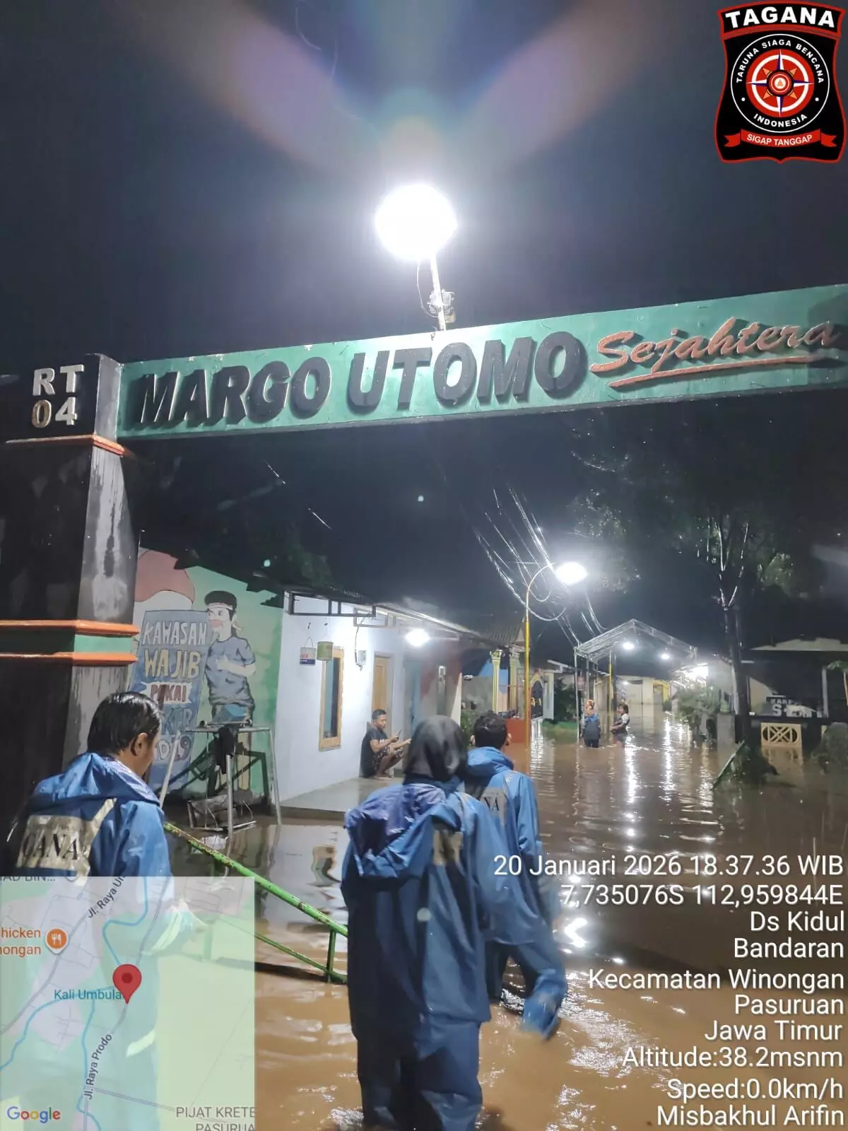 Banjir terjadi akibat hujan lebat dan luapan Sungai DAS Resojo dan Sungai Andil di Desa Bandaran, Selasa (20/01/2026). Tinggi muka air mencapai 40 hingga 75 sentimeter dan merendam ratusan rumah penduduk mulai sore hari.