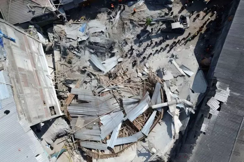 Foto udara tim gabungan melakukan pembongkaran material untuk memudahkan pencarian korban bangunan mushalla ambruk di Pondok Pesantren (Ponpes) Al Khoziny di Kecamatan Buduran, Sidoarjo, Jawa Timur, Sabtu (4/10/2025). ANTARA FOTO/Umarul Faruq