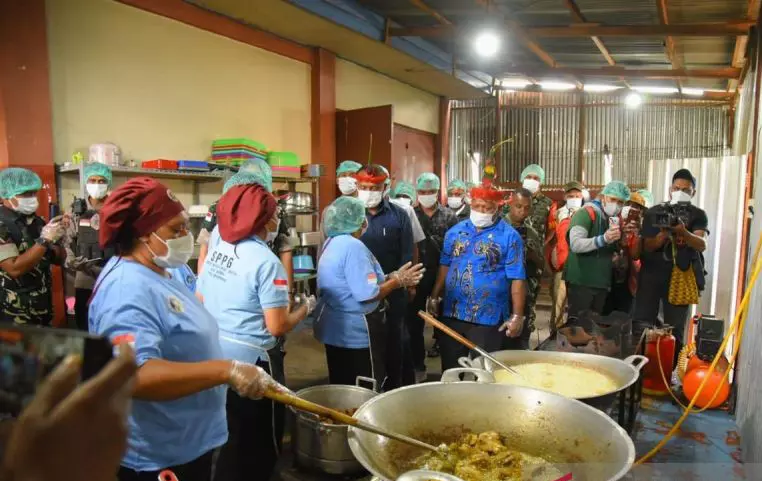 Danrem 172/PWY Brigjen TNI Tagor Rio Pasaribu dan Dandim 1702/Jayawijaya Letkol Arh Reza ChA Mamoribo mendampingi anggota Komisi XIII DPR RI Yan P Mandenas melihat secara langsung proses memasak di salahh satu dapur MBG di Wamena, Kabupaten Jayawijaya, Papua Pegunungan.(ANTARA/HO-Dok Kodim 1702 Jayawijaya).