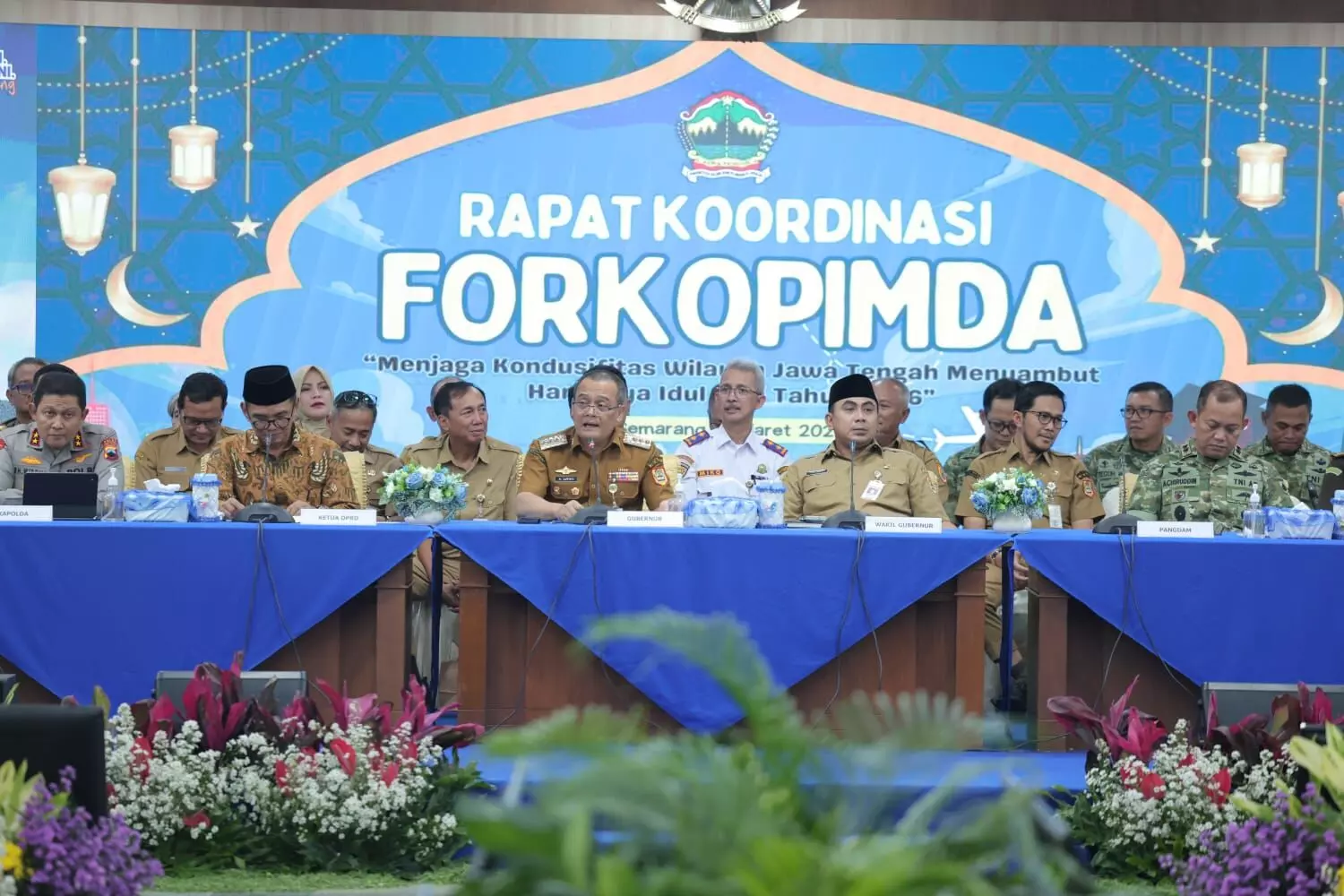 Dengan mengusung tema “Menjaga Kondusifitas Wilayah Jawa Tengah Menyambut Hari Raya Idul Fitri Tahun 2026,” Gubernur Jawa Tengah Ahmad Lutfi memimpin Rapat Koordinasi Forum Koordinasi Pimpinan Daerah (Forkopimda) Provinsi Jawa Tengah di Gedung Gradhika Bhakti Praja, Kompleks Gubernuran Jateng, Senin (9/3) pagi.