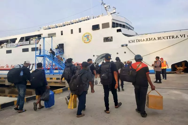 Sebagian warga menuju KM Dharma Rucitra VI di Pelabuhan Sampit, Kabupaten Kotawaringin Timur, Kalimantan Tengah untuk mudik Lebaran lebih awal guna menghindari kepadatan penumpang saat arus mudik, Kamis (26/2/2026). ANTARA/Dokumentasi Pribadi.