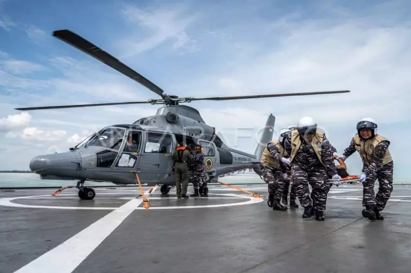 Prajurit KRI dr Soeharso-990 Satgas TNI AL menurunkan warga yang sakit saat evakuasi medis lewat udara bagi korban bencana alam di Desa Marlempang, Aceh Tamiang, Aceh, Kamis (11/12/2025). ANTARA FOTO/Bayu Pratama S/nym.