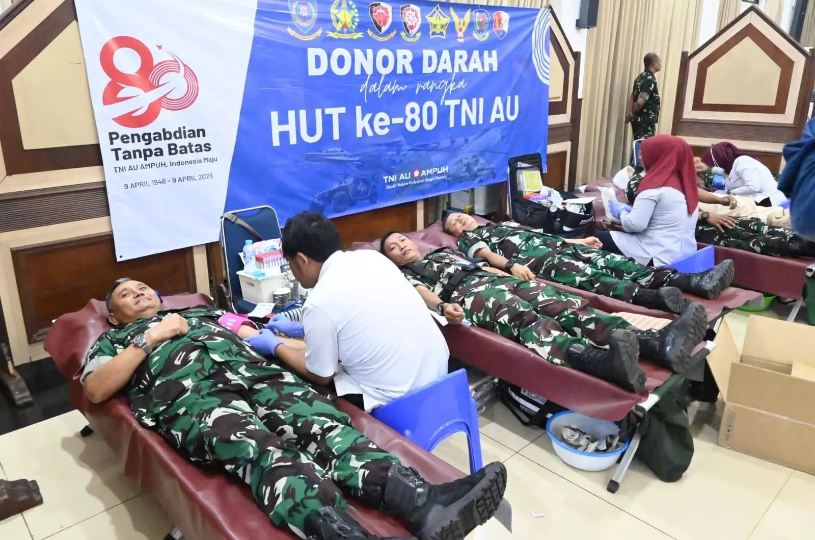 Komando Operasi Udara Nasional (Koopsudnas) menggelar kegiatan donor darah dalam rangka peringatan Hari Ulang Tahun (HUT) ke-80 TNI Angkatan Udara. Dari kegiatan tersebut, terkumpul sebanyak 170 kantong darah yang akan disalurkan kepada masyarakat melalui Palang Merah Indonesia (PMI).