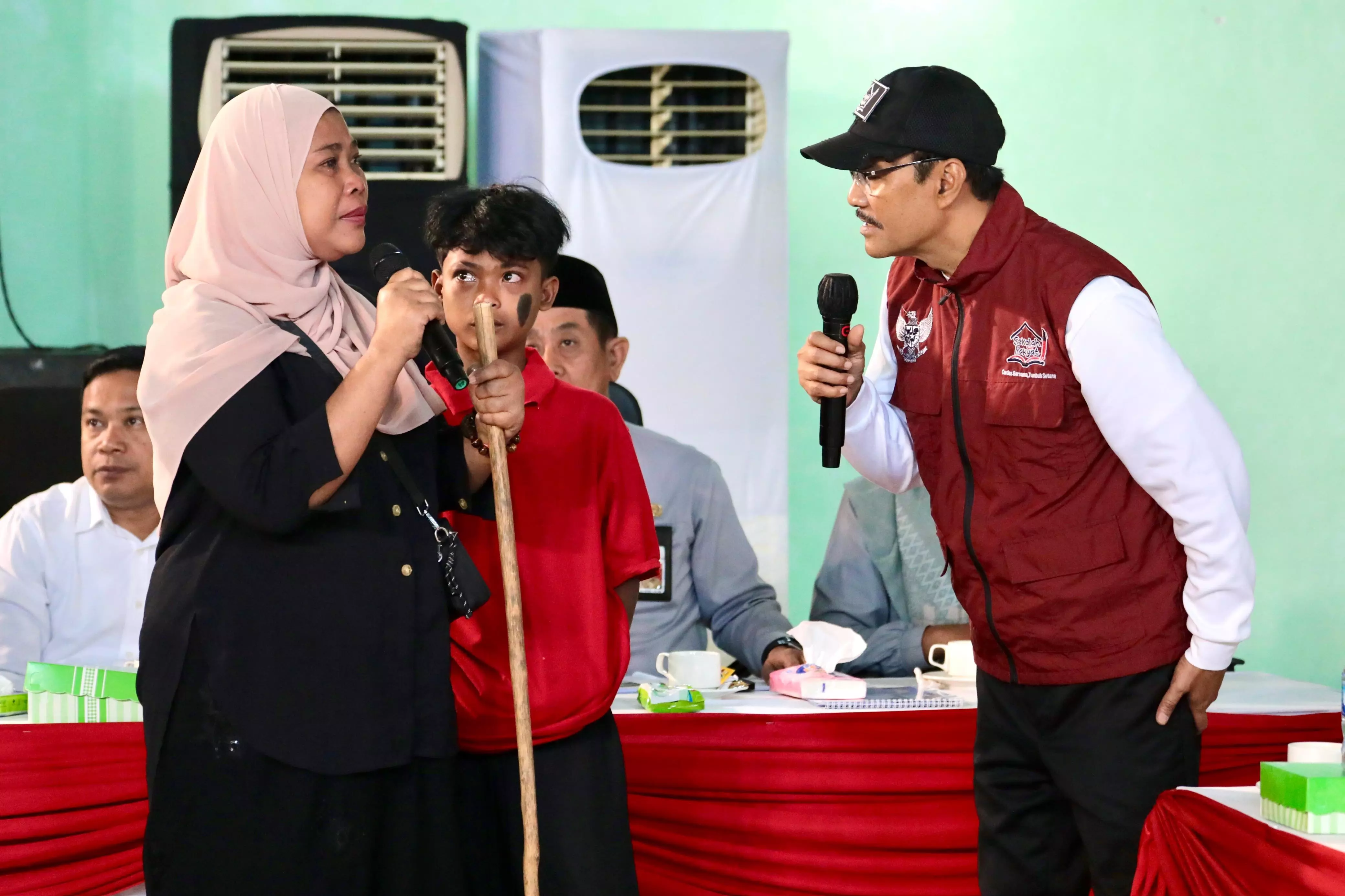 Suasana haru menyelimuti acara Dialog Siswa Sekolah Rakyat Terintegrasi (SRT) 46 Banyuwangi, Jawa Timur, Jumat (3/10/2025). Menteri Sosial Saifullah Yusuf mengajak Nur Wahidah, seorang tunanetra dan ibunda dari Mohammad Rehan Meizi (12), siswa Sekolah Rakyat, maju ke depan.