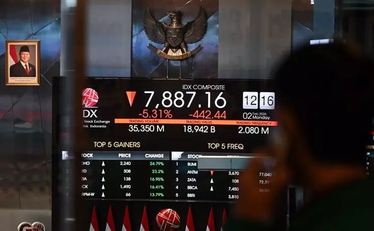 Pengunjung mengamati layar digital pergerakan Indeks Harga Saham Gabungan (IHSG) di Bursa Efek Indonesia, Jakarta, Senin (2/2/2026). IHSG perdagangan sesi I ditutup melemah 442,44 poin atau 5,31 persen ke posisi 7.887,16, dengan kelompok 45 saham unggulan indeks LQ45 turun 33,16 poin atau 3,98 persen ke posisi 800,37. ANTARA FOTO/Sulthony Hasanuddin/nz