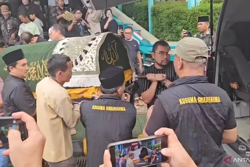 Jenazah mantan Ketua Komisi Pemberantasan Korupsi (KPK) periode 2007-2009 Antasari Azhar saat dibawa ke ambulanz untuk menuju ke Kawasan Pemakaman Pemakaman San Diago Hills Memorial Park di Telujambe, Karawang, Jawa Barat ANTARA/Azmi Samsul M.