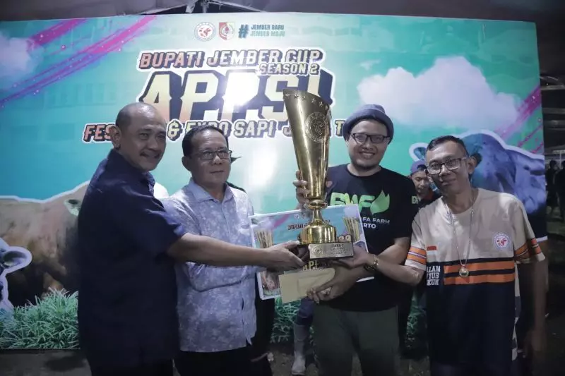 Pj Sekda Jember Jupriono (dua dari kiri) menyerahkan piala, sertifikat dan uang pembinaan kepada Faisal pemilik sapi bernama Sapu Jagat yang meraih juara dalam Festival dan Expo Sapi di Jember Sport Garden, Minggu (2/11/2025) malam. ANTARA/HO-Diskominfo Jember