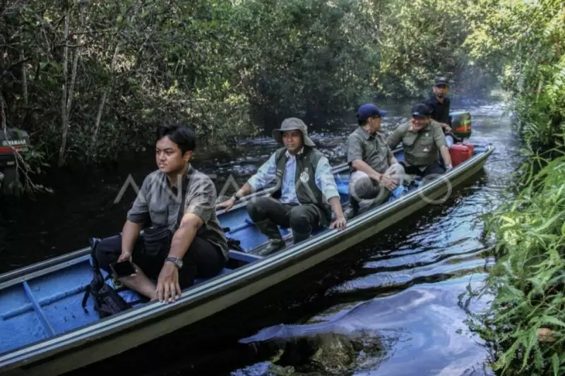 Arsip - Menteri Kehutanan Raja Juli Antoni (kedua kiri) dan lainnya menggunakan perahu mesin melintasi sekat kanal di Taman Nasional Sebangau, Palangka Raya, Kalimantan Tengah, (16/4/2025). (ANTARA/Auliya Rahman/Spt.).