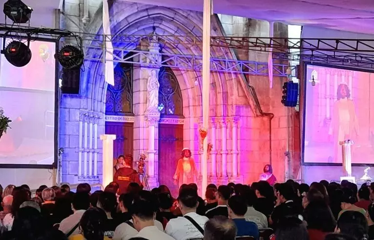 Umat Katolik menyaksikan pertunjukan teatrikal sebagai rangkaian dari perayaan Tri Hari Suci Paskah di Gereja Katedral Jakarta, Jumat (3/4/2026). ANTARA/Lintang Budiyanti Prameswari.