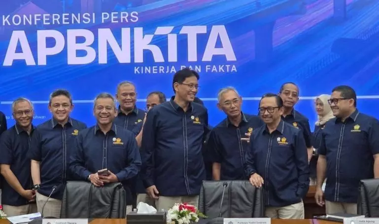 Wakil Menteri Keuangan (Wamenkeu) Suahasil Nazara (ketiga dari kiri) menghadiri konferensi pers APBN KiTa Edisi Maret 2026 di Jakarta, Rabu (11/3/2026). ANTARA/Bayu Saputra.