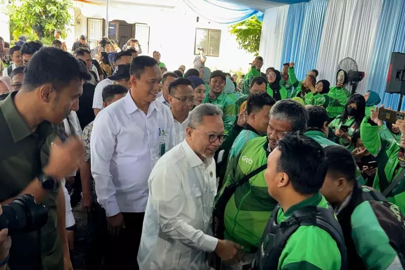 Menteri Koordinator Bidang Pangan Zulkifli Hasan (tengah) didampingi Direktur Utama Perum Bulog Ahmad Rizal Ramdhani (kedua kiri) menyalami pengemudi ojek online dalam kegiatan Penjualan Pangan Murah bagi pengemudi ojol di Tangerang, Banten, Kamis (18/12/2025). ANTARA/HO-Bulog