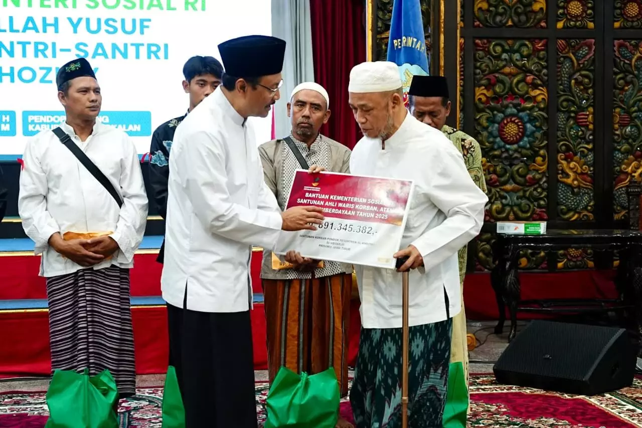 Menteri Sosial (Mensos) Saifullah Yusuf (Gus Ipul) menghadiri tahlilan sekaligus menyerahkan santunan untuk para santri korban rubuhnya Pondok Pesantren (Ponpes) Al-Khoziny Sidoarjo. Acara digelar di Pendopo Agung Kabupaten Bangkalan, Jawa Timur, Sabtu (18/10/2025) malam.
