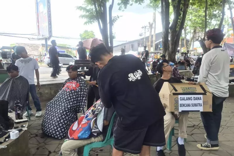 Puluhan pekerja pangkas rambut dan pijat kretek Jambi menggalang dana bencana Sumatera melalui kegiatan aksi sosial bayar seikhlasnya, kegiatan terbuka untuk umum itu digelar di halaman parkir taman Banjuran Budayo, Kota Jambi.