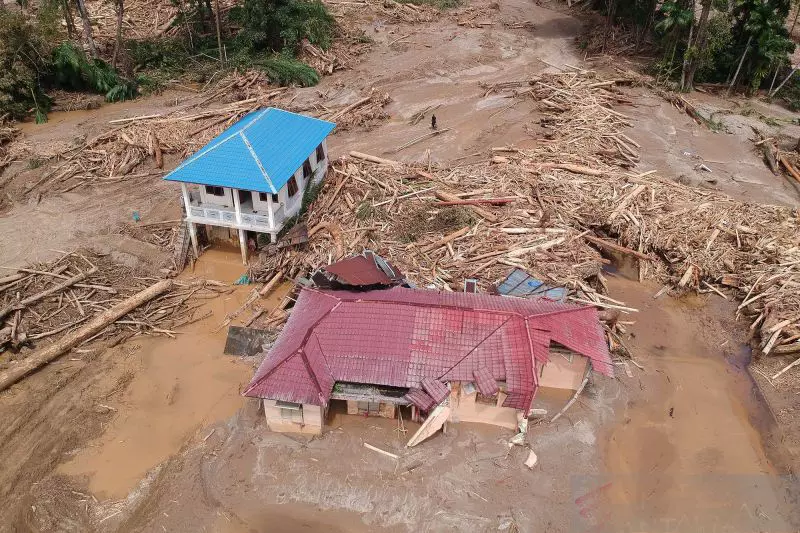 Foto udara permukiman warga terdampak banjir bandang di Desa Aek Garoga, Kecamatan Batang Toru, Kabupaten Tapanuli Selatan, Sumatera Utara, Sabtu (29/11/2025). ANTARA FOTO/Yudi Manar/agr.