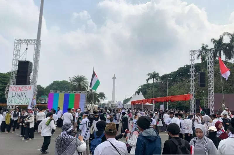 Ribuan warga mengikuti aksi bela Palestina bertajuk "Indonesia Melawan Genosida" yang digelar di kawasan Patung Kuda, Monas, Jakarta Pusat pada Ahad pagi. Ribuan warga tersebut didominasi mengenakan pakaian putih dan membawa ornamen Palestina baik mengenakan syal, topi, selendang, bendera, hingga spanduk berisikan dukungan kepada Palestina.