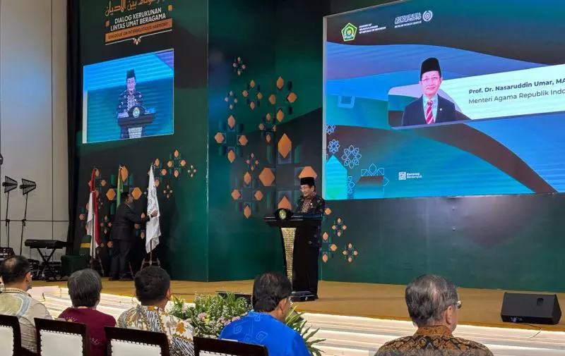 Menag Nasaruddin Umar memberikan arahan dalam Dialog Kerukunan Lintas Umat Beragama di Kantor Kemenag, Jakarta, Sabtu (6/12/2025) ANTARA/Prisca Triferna.