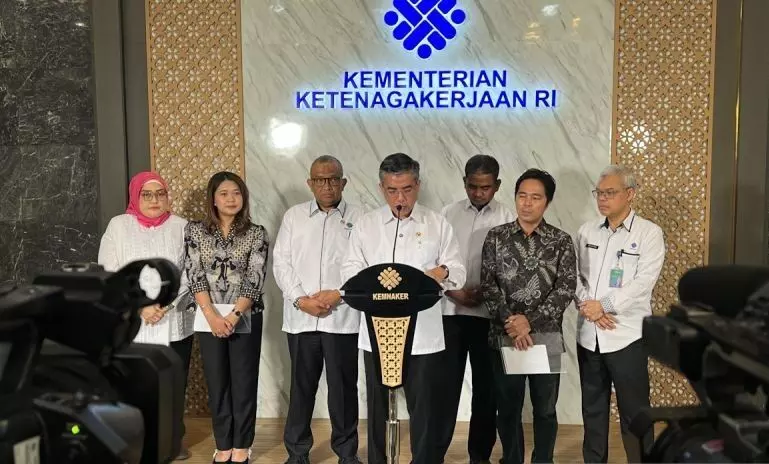 Menteri Ketenagakerjaan (Menaker) Yassierli didampingi jajarannya dalam jumpa pers di Jakarta, Rabu (1/4/2026). ANTARA/Harianto