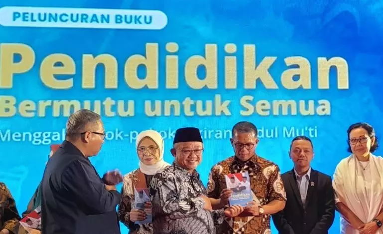 Mendikdasmen Abdul Mu'ti (depan, kedua dari kiri) dalam peluncuran buku "Pendidikan Bermutu untuk Semua: Mengenali Pokok-pokok Pikiran Abdul Mu'ti" di Jakarta, Senin (27/10/2025) malam. ANTARA/Lintang Budiyanti Prameswari