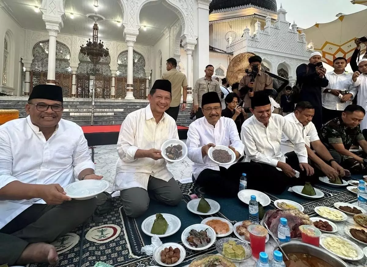 Menteri Sosial Saifullah Yusuf (Gus Ipul) bersama Menteri Dalam Negeri Muhammad Tito Karnavian menghadiri buka puasa bersama ribuan masyarakat di halaman Masjid Raya Baiturrahman, Banda Aceh, Jumat (6/3/2026).