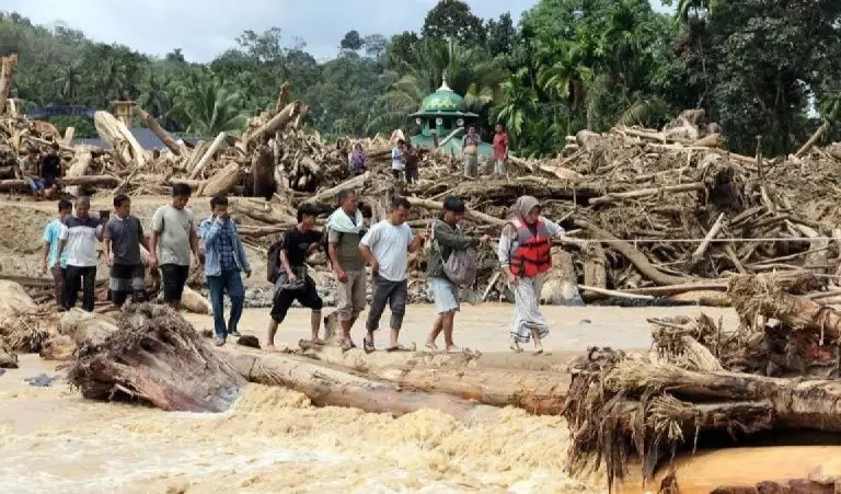 Warga berjalan melintasi sungai dengan jembatan darurat di Desa Aek Garoga, Kecamatan Batang Toru, Kabupaten Tapanuli Selatan, Sumatera Utara, Sabtu (29/11/2025). Warga terpaksa melintasi jembatan darurat dari batang kayu akibat jalan dan jembatan penghubung antara Kabupaten Tapanuli Selatan menuju Tapanuli Tengah-Sibolga serta Medan putus diterjang banjir bandang pada Selasa (29/11).ANTARA FOTO/Yudi Manar/bar/pri.