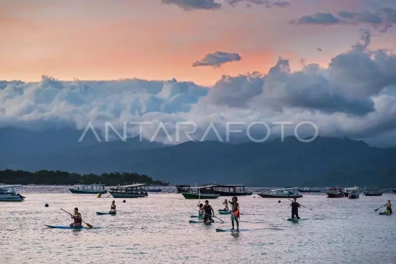 Sejumlah wisatawan asing bermain paddel board atau papan dayung di kawasan taman wisata perairan Gili Matra di Gili Trawangan, Desa Gili Indah, Kecamatan Pemenang, Tanjung, Lombok Utara, NTB, Sabtu (5/7/2025). Kawasan konservasi nasional taman wisata perairan (TWP) Gili Air, Gili Meno dan Gili Trawangan atau yang lebih dikenal dengan Gili Matra memiliki potensi alam bahari yang indah, antara lain hamparan pasir putih dan lautnya yang jernih serta terumbu karang dengan ikan yang beranekaragam yamg mampu menarik wisatawan baik lokal maupun mancanegara. ANTARA FOTO/Ahmad Subaidi/nz.