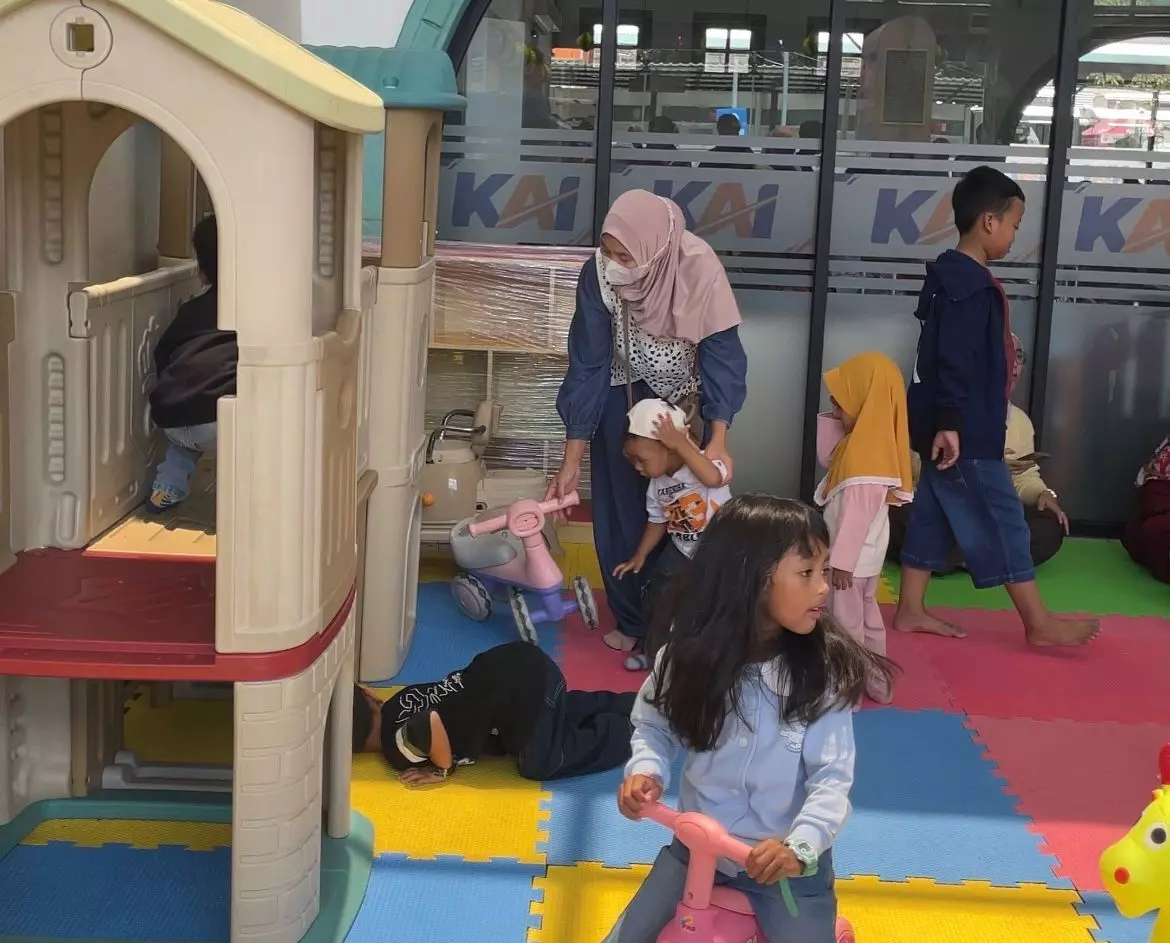 Di tengah meningkatnya arus penumpang menjelang Lebaran, suasana menunggu di stasiun kini terasa lebih ramah bagi keluarga. Sejumlah fasilitas hiburan disediakan untuk membuat waktu tunggu pemudik menjadi lebih nyaman.