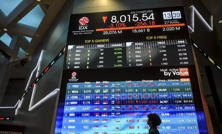 Pengunjung melintas di depan layar yang menampilkan pergerakan harga saham di Bursa Efek Indonesia, Jakarta, Senin (27/10/2025). Indeks Harga Saham Gabungan (IHSG) pada Senin (27/10) ditutup melemah 154,57 poin atau 1,87 persen ke level 8.117,15. ANTARA FOTO/Hafidz Mubarak A/YU