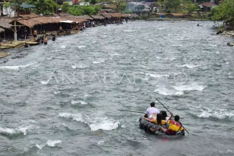 Pengunjung menyusuri sungai menggunakan ban di Bukit Lawang, Langkat, Sumatera Utara, Minggu (19/1/2025). ANTARA FOTO/Fransisco Carolio/foc.