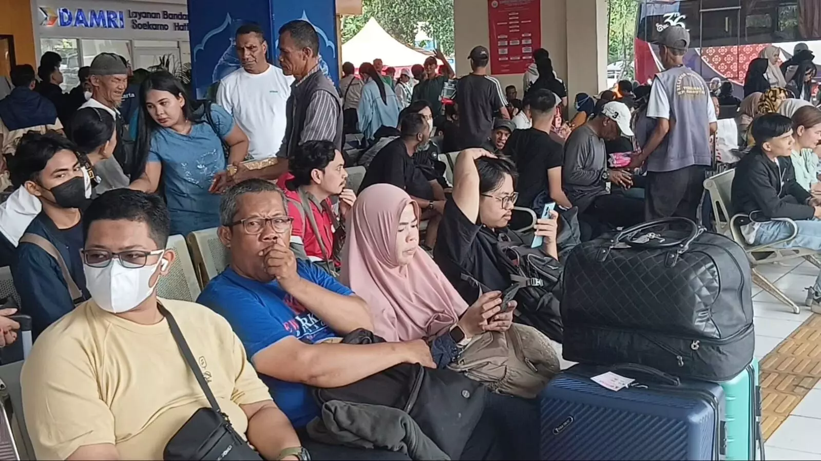Sebagian calon pemudik tampak duduk di kursi ruang tunggu sambil menjaga barang bawaan.