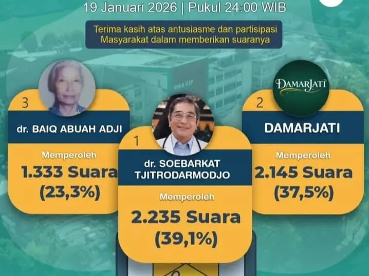 Tercatat, polling berakhir tanggal 19 Januari 2026 lalu dengan muncul satu nama yang paling banyak diinginkan sebagai nama Rumah Sakit Umum Daerah (RSUD) Salatiga yakni dr Soebarkat Tjitrodarmodjo dengan perolehan 2.235 suara atau 39,1 persen.