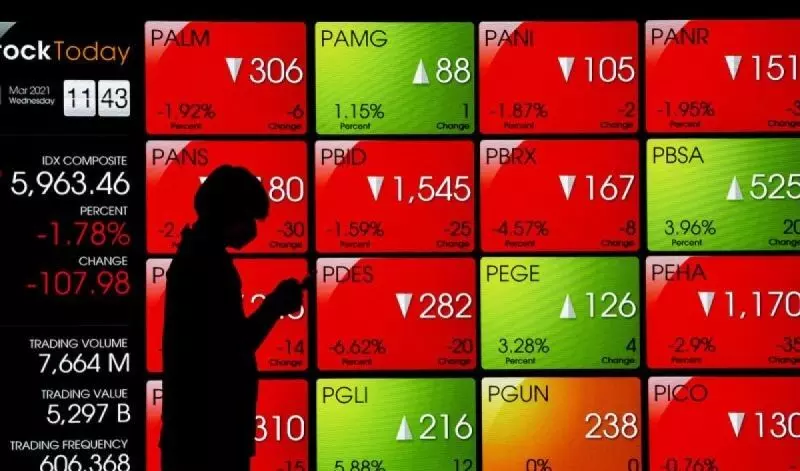 Ilustrasi - Pekerja melihat telepon pintarnya dengan latar belakang layar pergerakan harga saham di Bursa Efek Indonesia, Jakarta. (ANTARA FOTO/Muhammad Adimaja/rwa.)