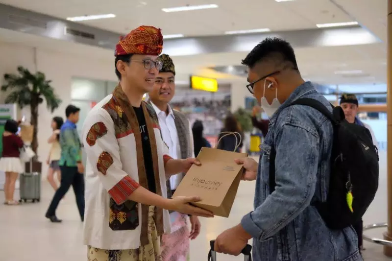 Pihak Bandara Lombok melaksanakan seremonial penyambutan penumpang perdana tahun 2026 pada Kamis (1/1), dengan mengalungkan selendang tenun khas Lombok serta pemberian souvenir.