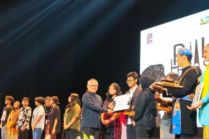 Penyerahan hadiah kepada pemenang lomba musikalisasi puisi dalam Malam Anugerah Piala H.B. Jassin 2025 di Taman Ismail Marzuki, Jakarta, Sabtu (18/10/2025) malam. ANTARA/Juliyanti