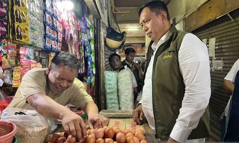 Direktur Utama Perum Bulog Ahmad Rizal Ramdhani melakukan inspeksi pengecekan harga sejumlah komoditas pangan strategis di Pasar Rawamangun, Jakarta, Rabu (24/12/2025). ANTARA/Harianto