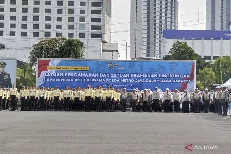 Sejumlah peserta dari Satuan Pengamanan dan Satuan Keamanan Lingkungan wilayah Polda Metro Jaya mengikuti apel PAM Swakarsa di Lapangan Presisi Ditlantas Polda Metro Jaya, Jumat (28/11/2025). (ANTARA/Ilham Kausar).
