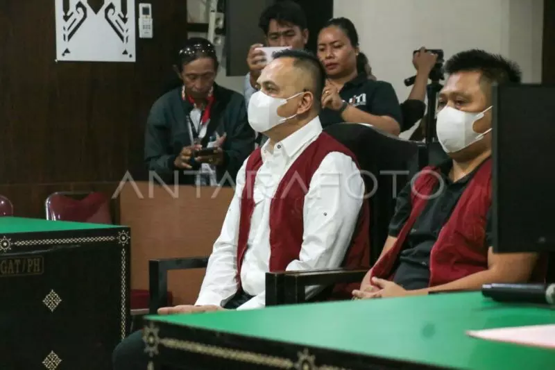 Kompol I Made Yogi Purusa Utama (kiri) dan Ipda I Gde Aris Chandra Widianto (kanan) menjalani sidang dakwaan di Pengadilan Negeri Mataram, NTB, Senin (27/10/2025). ANTARA FOTO/Dhimas Budi Pratama