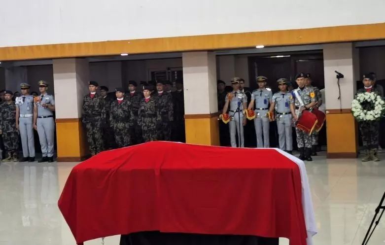 Politeknik Ahli Usaha Perikanan (AUP), Pasar Minggu, Jakarta Selatan, memberikan penghormatan terakhir kepada jenazah salah satu korban kecelakaan pesawat ATR 42-500 di Gunung Bulusaraung, Kabupaten Pangkajene Kepulauan (Pangkep), Sulawesi Selatan, Deden Maulana (43) pada Kamis.