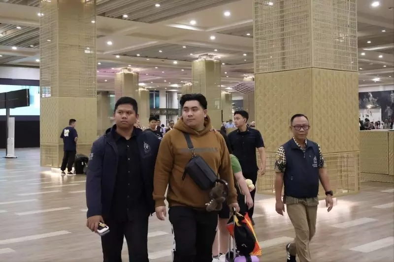 Tim gabungan Polri menangkap buronan interpol pelaku jaringan TPPO dan penipuan daring, Rifaldo Aquiono Pontoh, di Bandara Internasional I Gusti Ngurah Rai, Bali, Sabtu (21/2/2026). (ANTARA/HO-Polri)