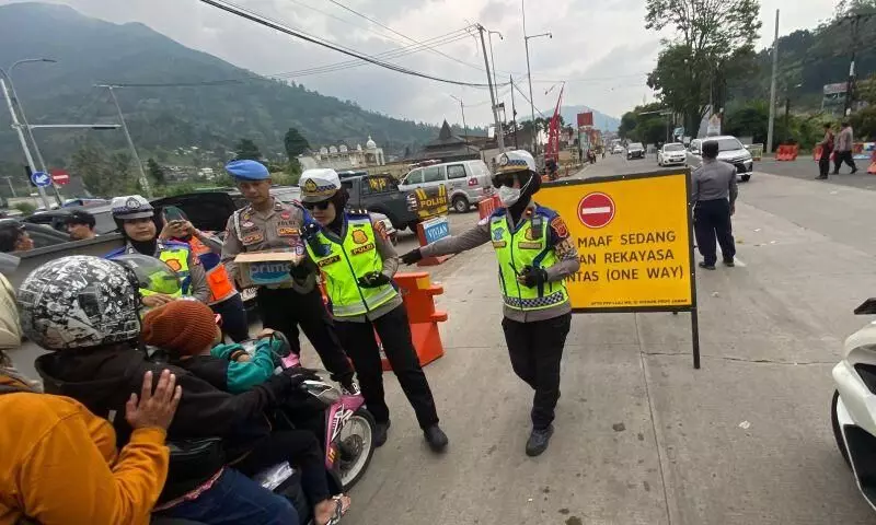 Polwan membagi-bagikan makanan dan minuman untuk pengendara selama diberlakukannya sistem satu arah di jalur utama Bandung-Garut wilayah Kubang, Kabupaten Garut, Jawa Barat, Rabu (25/3/2026). ANTARA/Feri Purnama
