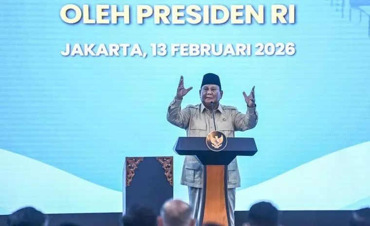 Presiden Prabowo Subianto menyampaikan pidato sambutan dalam peresmian secara serentak 1.072 Satuan Pelayanan Pemenuhan Gizi (SPPG) Polri se-Indonesia di SPPG Palmerah, Jakarta, Jumat (13/2/2026). Acara tersebut juga sekaligus sebagai peresmian 18 gudang ketahanan pangan Polri yang tersebar di 12 Polda dan peletakan batu pertama atau groundbreaking di 107 SPPG Polri sebagai bagian dukungan Polri terhadap program MBG. ANTARA FOTO/Galih Pradipta/wsj. (ANTARA FOTO/GALIH PRADIPTA)