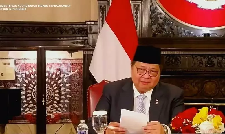 Menteri Koordinator Bidang Perekonomian Airlangga Hartarto dalam konferensi pers secara daring di Jakarta, Selasa (23/12/2025) (ANTARA/Bayu Saputra)