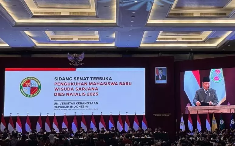 Presiden Prabowo Subianto saat memberikan paparan pada orasi ilmiah Universitas Kebangsaan Republik Indonesia (UKRI) di Kota Bandung, Jawa Barat, Sabtu (18/10/2025). ANTARA/Rubby Jovan
