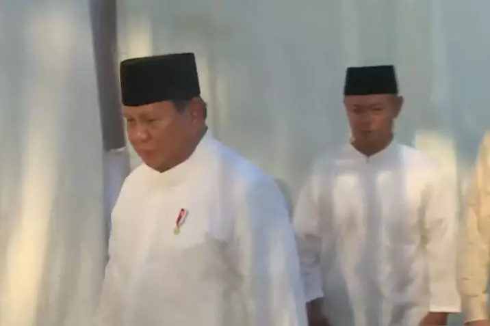 Dipantau melalui siaran langsung Sekretariat Presiden dari Jakarta, Sabtu, Presiden Prabowo tiba di masjid sekitar pukul 07.20 WIB dengan mengenakan baju koko putih, celana hitam, serta peci hitam.
