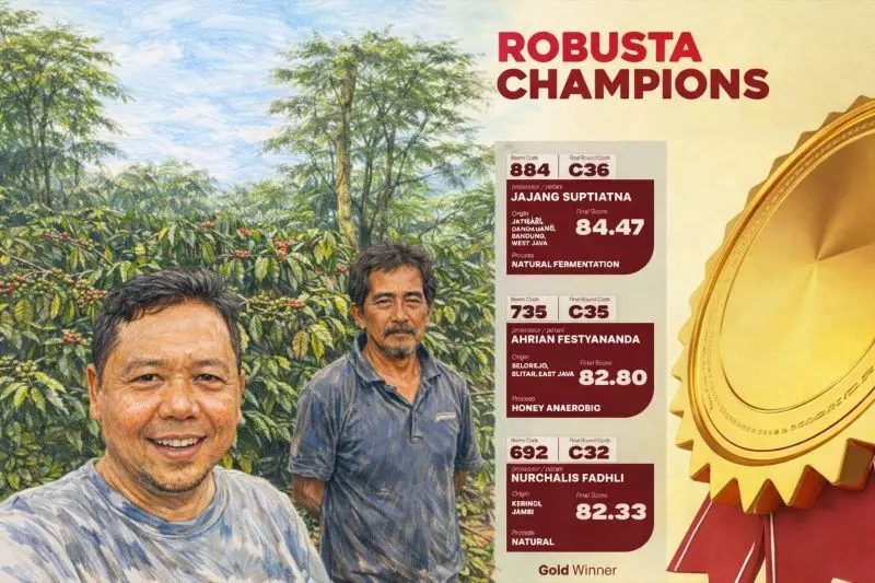 Ahrian memperoleh skor 82,80 melalui kopi Robusta Selorejo, Kabupaten Blitar, dengan metode proses honey anaerobic.
