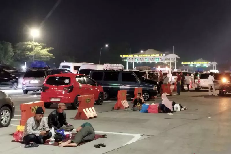 Puluhan mobil pemudik menepi dan berhenti di Gerbang Tol (GT) Cikampek Utama, Purwakarta, Jawa Barat, Rabu dini hari, untuk melaksanakan sahur saat rekayasa lalu lintas satu arah atau one way dalam momen arus mudik Lebaran 2026.