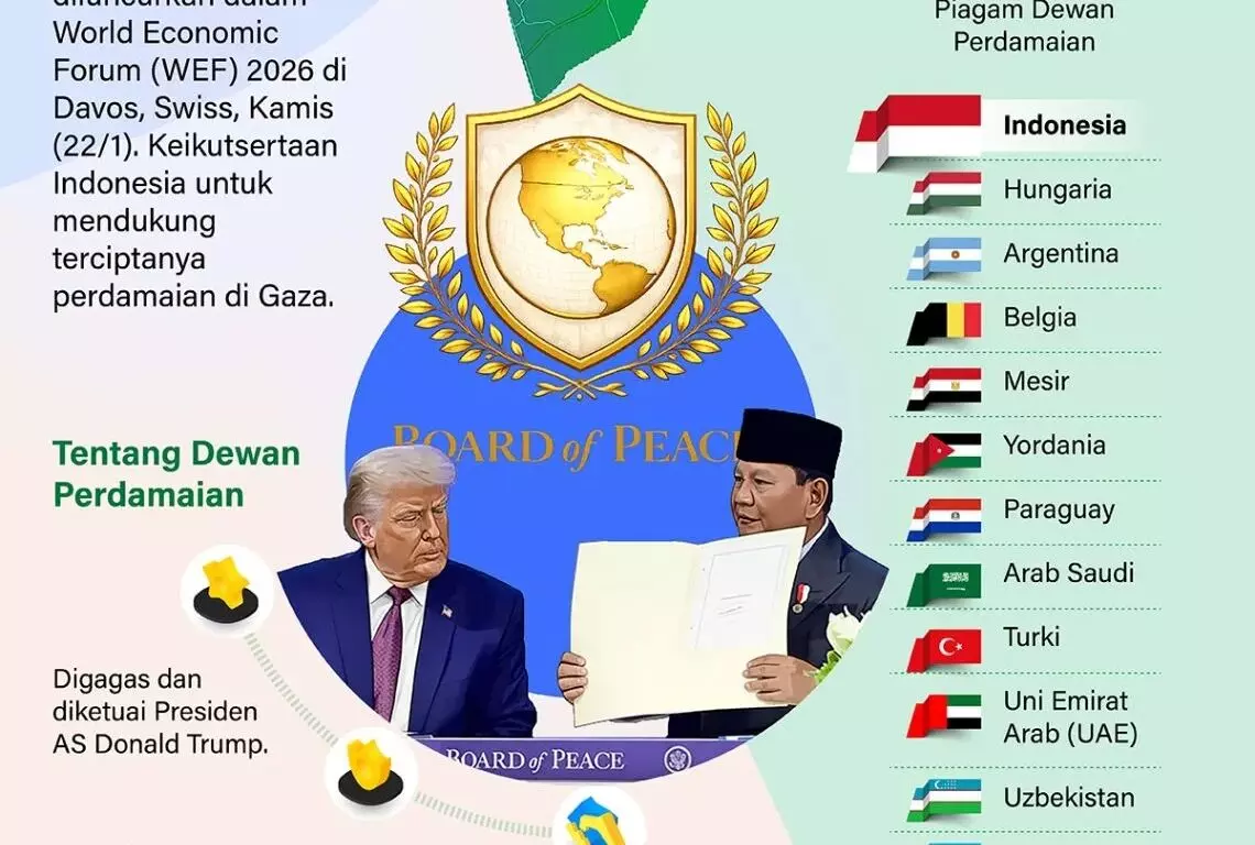 Dengan didampingi Presiden Trump, Presiden RI Prabowo Subianto menandatangani Piagam Dewan Perdamaian di sela-sela agenda World Economic Forum 2026 di Davos, Swiss, pada 22 Januari lalu.