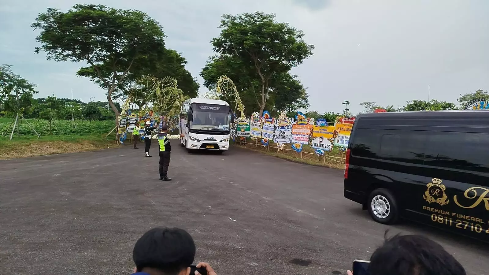 Sepanjang akses menuju lokasi pemakaman, terdapat puluhan penjor yang tertata apik di kanan kiri akses masuk makam beserta ratusan karangan bunga ucapan duka cita.