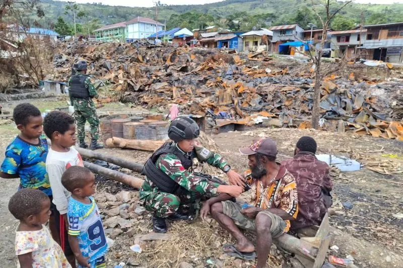 Satuan Tugas (Satgas) Pengamanan Perbatasan (Pamtas) Yonif 511/DY melakukan pemeriksaan kesehatan bagi korban kebakaran di Kabupaten Tolikara, Papua Pegunungan.
