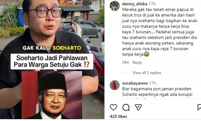 Sementara, pernyataan kontra juga dilontarkan warganet lainnya, seperti @denny_eliska. "Mereka gak tau tanah emas papua di keruk trus di jual ke amerika dan hasil jual nya soeharto bagi bagikan ke anak cucu nya makanya tanpa kerja bisa kaya 7 turunan.... Padahal semua juga tau soeharto sebelum jadi presiden dia hanya anak seorang petani, sekarang anak cucu nya kaya raya 7 turunan tanpa kerja😂"